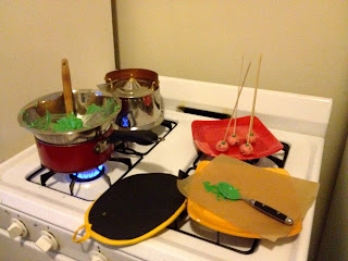 Once you have your cake balls, you come to the hard part - dipping them in the chocolate. I used Wilton's melting chocolate since it was at Michaels and came in green. These were my two amateur requirements - looking around now I see a lot more information from people who, unlike me, actually make candy more than once or twice a year: what type of chocolate to use, how to dye and flavor it, other chemistry considerations. But since I'm a baker, I'll just tell you what I learned in this particular adventure.